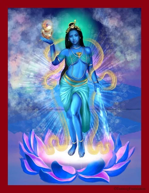 May the blessings of the blue water goddess prevail and spread our fortune and glory across appearance and may the lineage of the rigdzins pure visions be without interruption! May all beings not even know the word suffering and may realization dawn within the minds of all singing the song of naturalness!