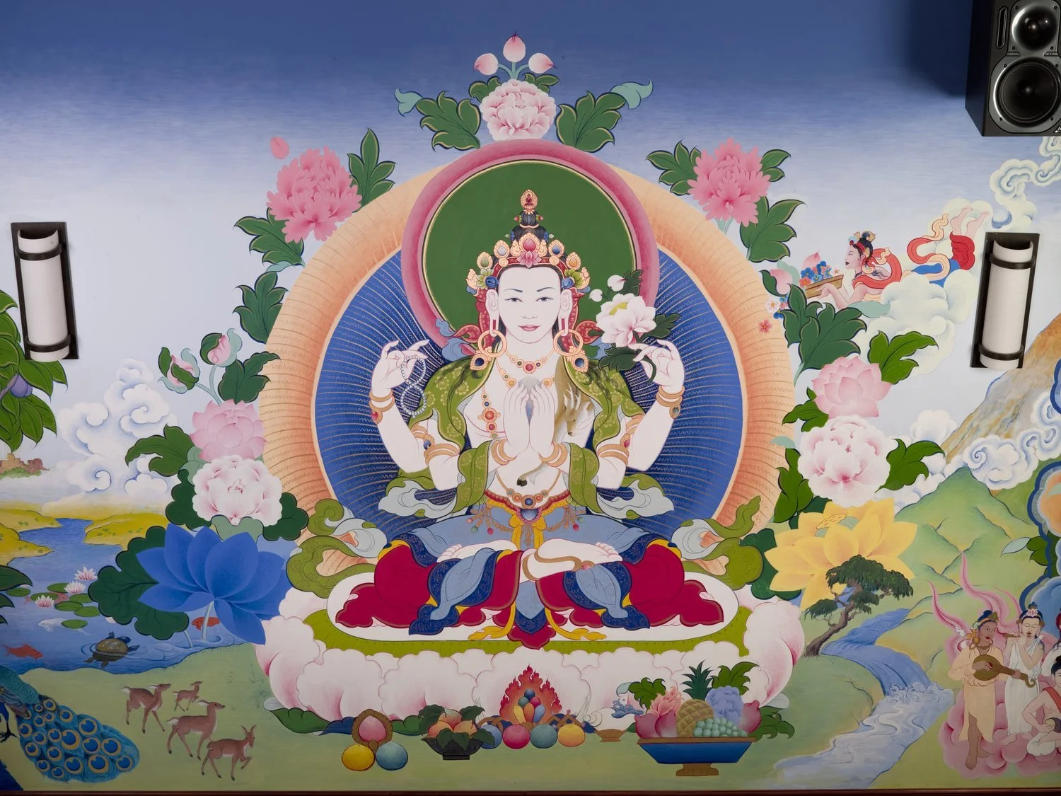 He has four arms which signify the four immeasurables – love, compassion, joy and equanimity/impartiality. His first two hands hold a wish fulfilling jewel at his heart. Light from this jewel emanates out to benefit beings without their ever knowing it. His second right hand holds a mala made of quartz which signifies his drawing beings up out of samsara. His second left hand holds a lotus symbolizing the Buddha’s absolute purity unstained by appearance emptiness. His jewels are the accomplishment of the six paramitas, his silks are all appearances as ornaments of Buddhahood. His antelope skin is a type only found in the god realms and is the seal of his perfect peace. The root lama of Chenrezig is Amitabha, Lord of Infinite Light, and he sits above his head.